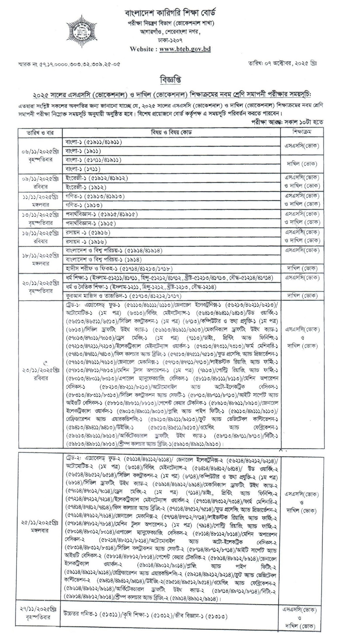 ২০২৫ সালের এসএসসি (ভোকেশনাল) নবম শ্রেণি সমাপনী পরীক্ষার জন্য শ্রেণি কার্যক্রমের সময় পরিবর্তন সংক্রান্ত জরুরী নোটিশ