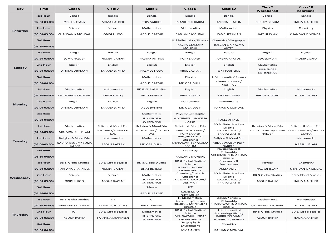 এতদ্বারা নবীনগর ইচ্ছাময়ী পাইলট উচ্চ বালিকা বিদ্যালয়ে সকল শিক্ষক ও শিক্ষার্থীদের জানানো যাইতেছে যে, করোনা পরিস্থিতি বিবেচনায় সরকারি নির্দেশনা মোতাবেক ষষ্ঠ থেকে দশম শ্রেণির সকল শিক্ষার্থীদের অনলাইনে শিক্ষা কার্যক্রম পরিচালনার অংশ হিসেবে অনলাইন ক্লাস পরিচালিত হয়ে আসছে। উক্ত অনলাইন ক্লাস পরবর্তী নির্দেশনা না দেওয়া পর্যন্ত নিম্নোক্ত সময়সূচী অনুযায়ী অনুষ্ঠিত হবে। সকল শিক্ষার্থীদের নিরাপদে ঘরে থেকে নিয়মিত অনলাইন ক্লাসে অংশগ্রহণ করার জন্য নির্দেশ দেওয়া হইল।