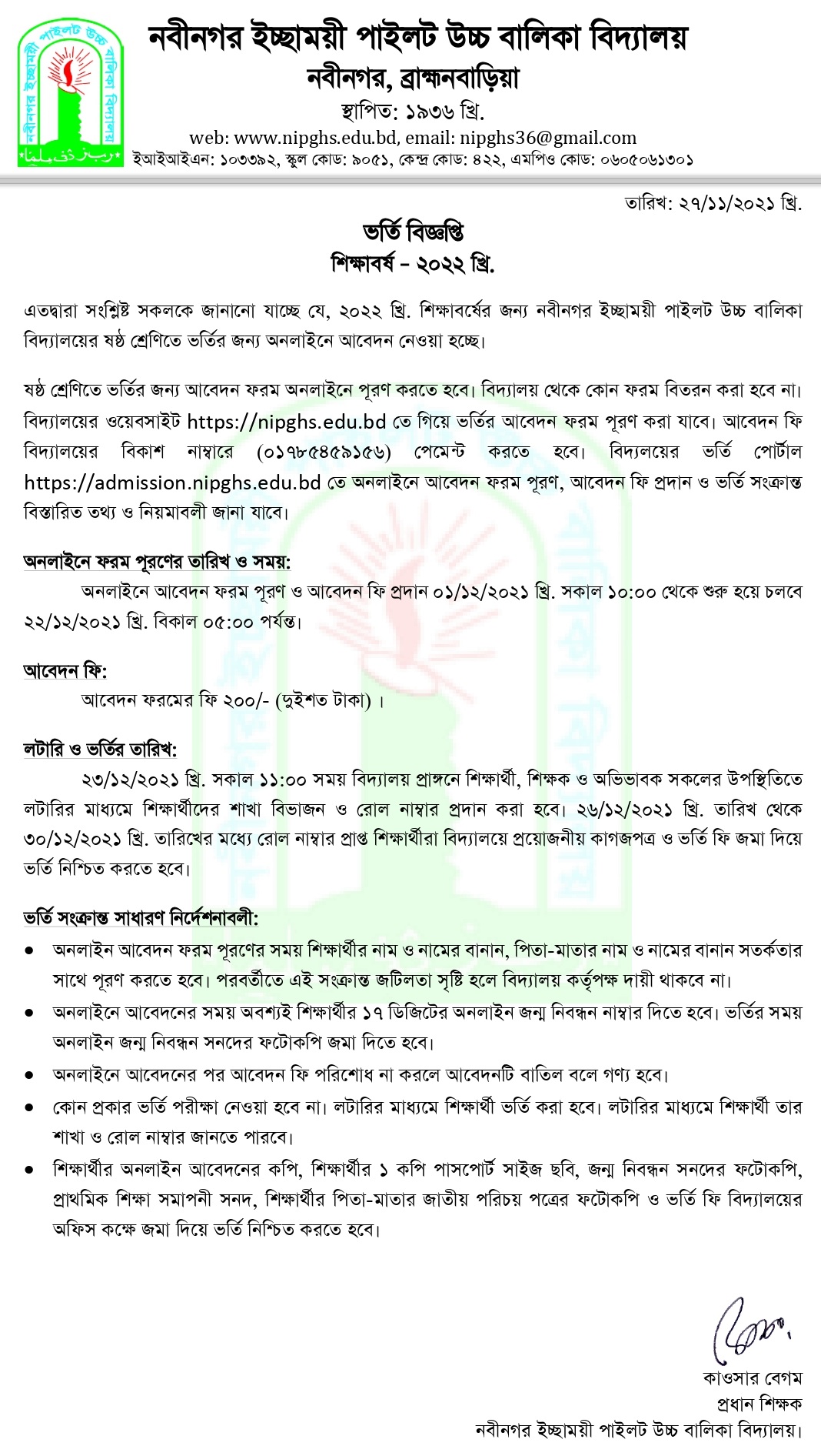 ২০২২ শিক্ষাবর্ষের জন্য ৬ষ্ঠ শ্রেণিতে ভর্তি বিজ্ঞপ্তি