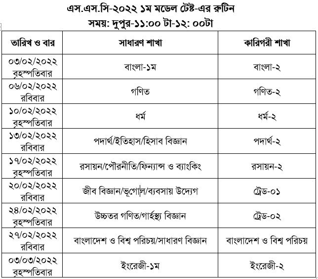 এস.এস.সি - ২০২২ পরীক্ষার্থীদের ১ম মডেল টেষ্ট পরীক্ষার রুটিন