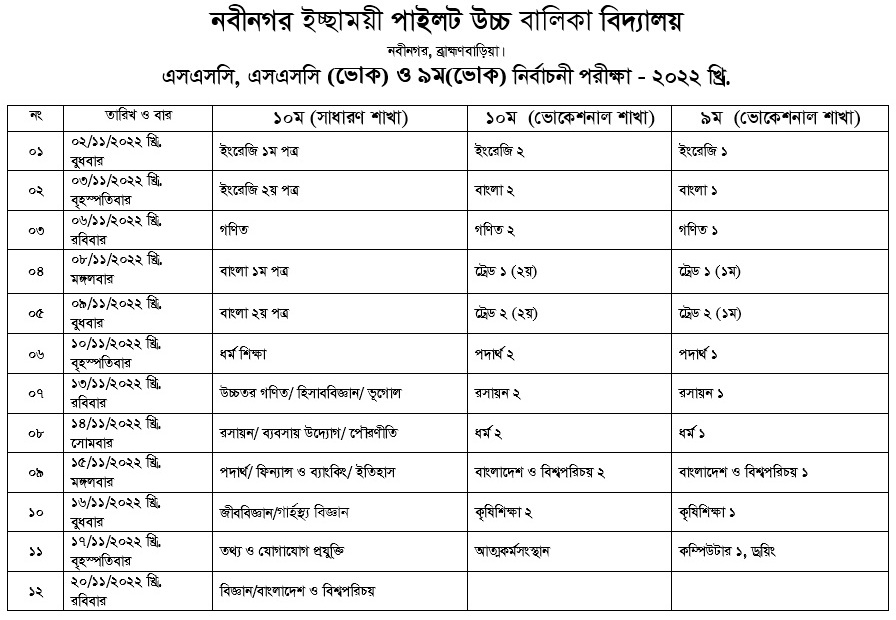 দশম, নবম (ভোকেশনাল) ও দশম (ভোকেশনাল) শ্রেণির নির্বাচনী পরীক্ষা– ২০২২ খ্রিষ্টাব্দ এর সময়সূচী