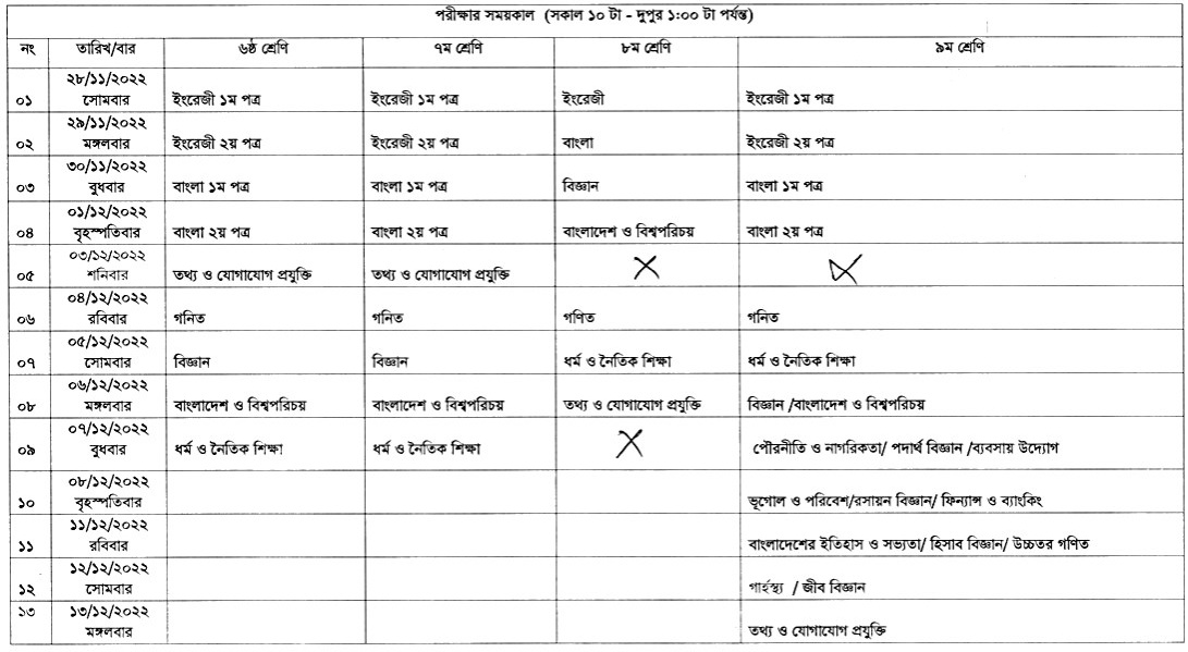 ষষ্ঠ থেকে নবম শ্রেণির বার্ষিক পরীক্ষা– ২০২২ খ্রিষ্টাব্দ এর সময়সূচী