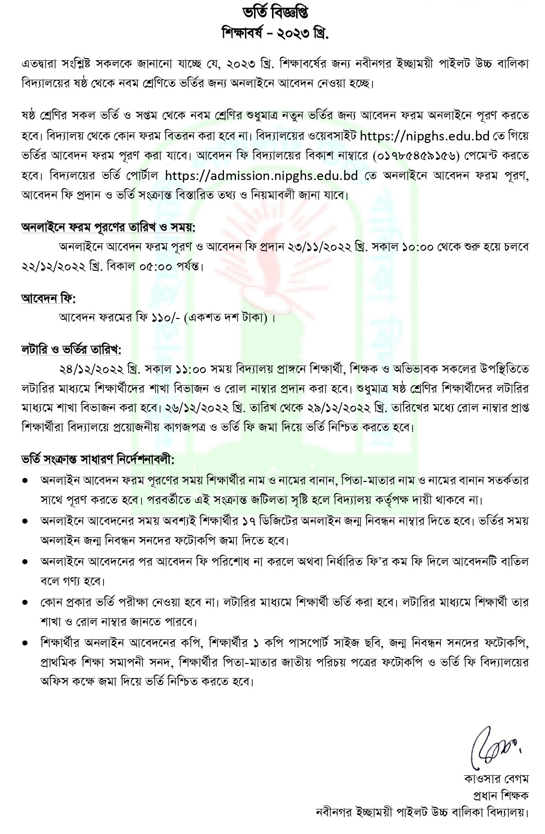ভর্তি বিজ্ঞপ্তি শিক্ষাবর্ষ – ২০২৩ খ্রি.